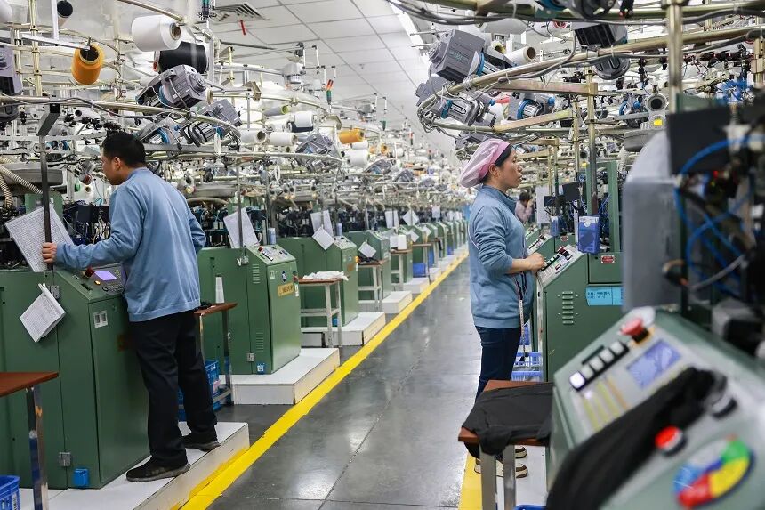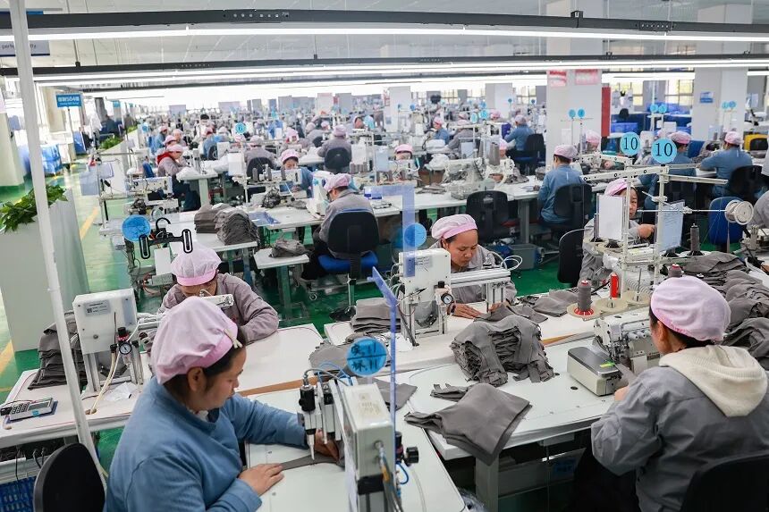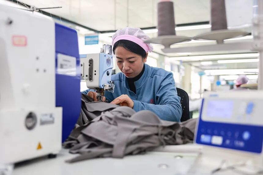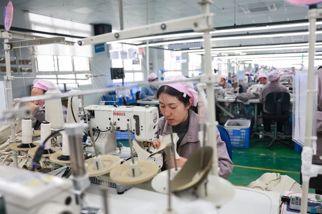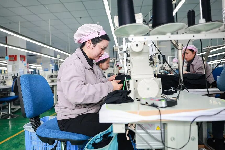 同样,在贵州鼎盛服饰有限公司的生产车间,也是一片忙碌而有序的场景。几百台缝纫机嗒嗒作响,工人们埋头裁剪、缝制,各种布料在她们手上变成一件件成衣,准备发往市场。