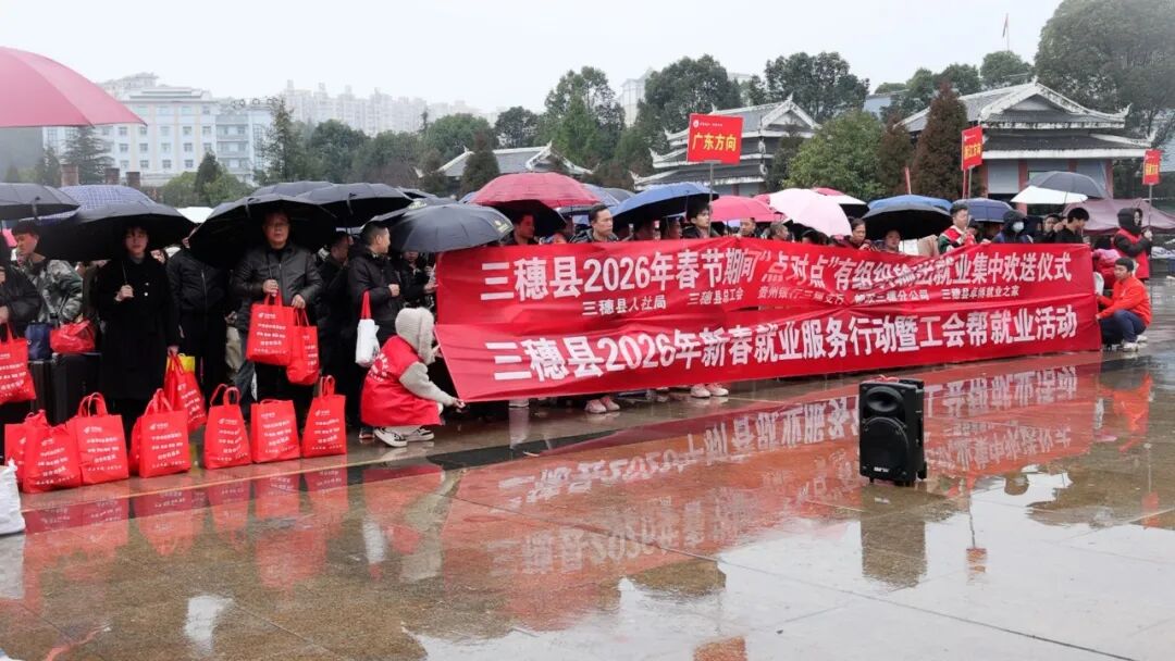 2月24日,三穗县2026年春节期间“点对点”有组织输出就业集中欢送仪式在将军广场举行,300余名务工人员乘坐专车奔赴广东、浙江、福建等地务工岗位。县委常委、副县长王媛参加仪式。