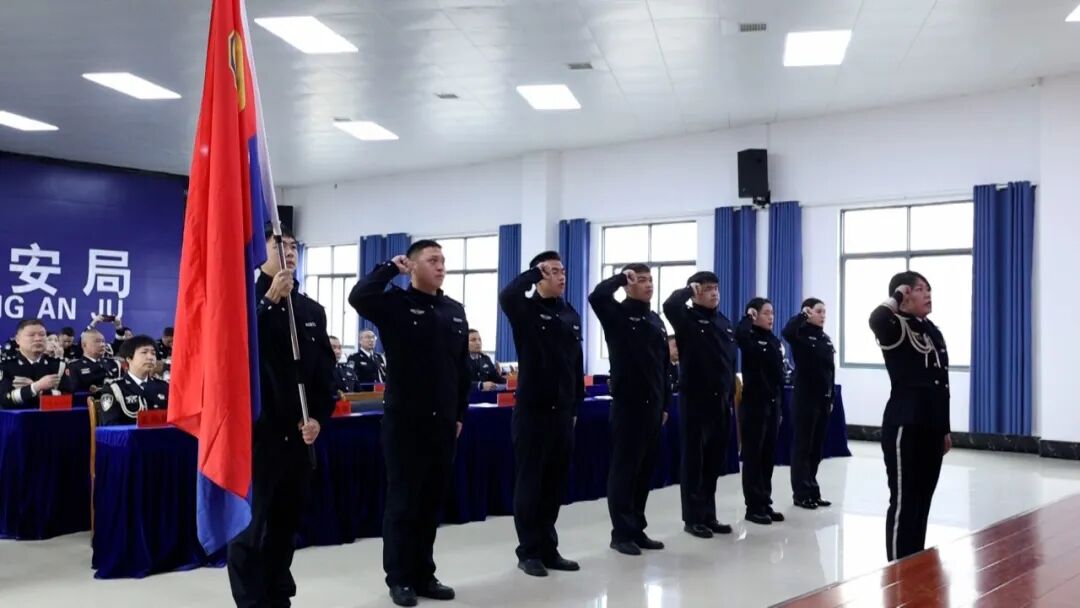 上午9时,英姿飒爽的护旗手迈着坚实有力的步伐走向升旗台。伴随着振奋激昂的旋律,中国人民警察警旗冉冉升起,全体人员精神抖擞、肃然列队,向警旗庄严行注目礼。升旗仪式后,在张全通同志的带领下,全场民辅警面向警旗,庄严举起右拳,集体重温入警誓词,铿锵誓言回荡现场,彰显着守护平安的坚定决心。