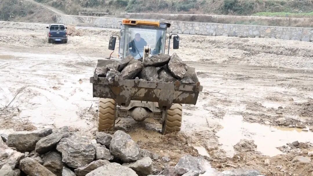 施工现场,工人们正用各类机械、工具清理河岸沿线的砂石,铺设道路、加固堤坝。挖掘机负责清理较大的树木和石块,并与人工协同作业,将石料有序运送至岸边施工区域。
